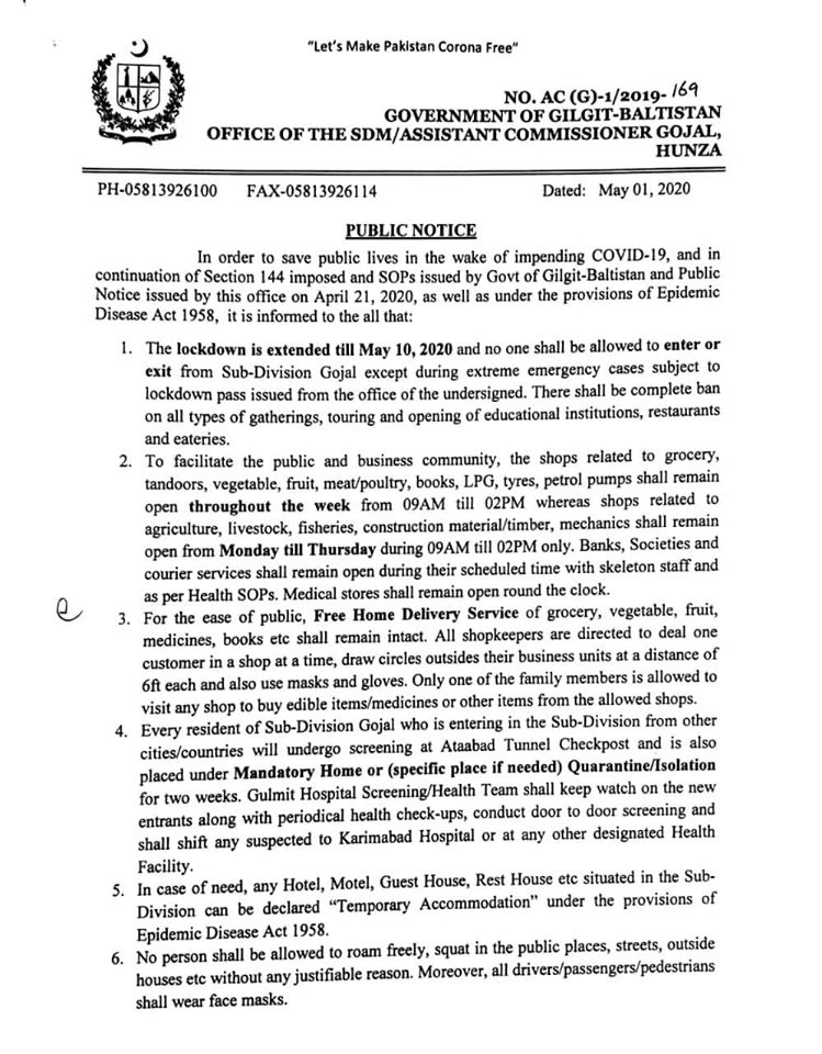 Office of the Assistant Commissioner subdivision Gojal has extended lockdown till May 10 throughout Gojal.